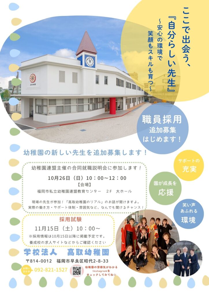 随時、園見学・自主実習等は受け付けておりますが、10月26日(日)に福岡市私立幼稚園の合同説明会にも参加します。